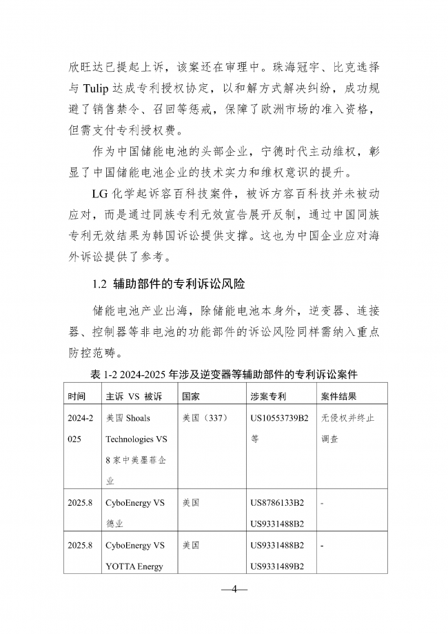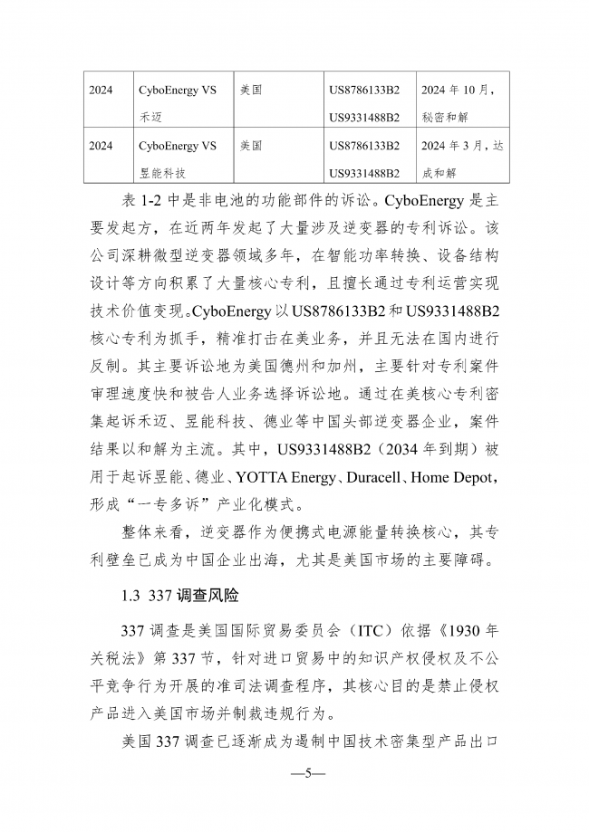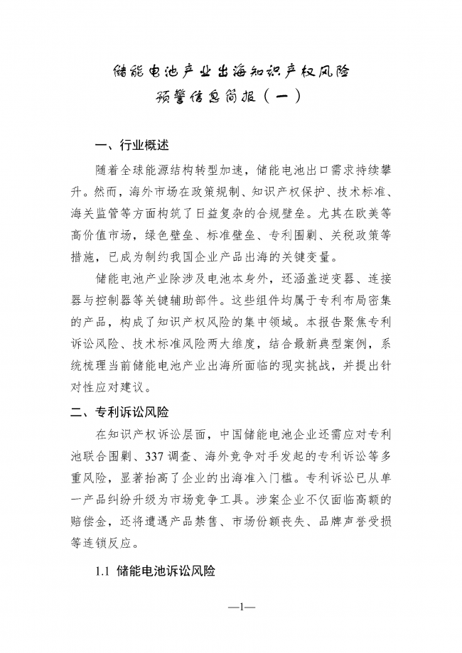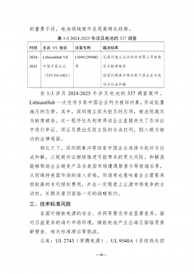 随着全球能源结构转型加速,储能电池出口需求持续攀升,但海外市场在政策规制、知识产权保护、技术标准、海关监管等方面构筑了日益复杂的合规壁垒,尤其在欧美等高价值市场,绿色壁垒、标准壁垒、专利围剿、关税政策等措施已成为制约我国企业产品出海的关键变量。储能电池产业除电池本身外,还涵盖逆变器、连接器与控制器等专利布局密集的关键辅助部件,构成知识产权风险集中领域。当前企业主要面临专利诉讼与技术标准两大核心风险:专利诉讼层面,需应对专利池联合围剿(如LG新能源与松下能源成立的Tulip Innovation专利池管理5000多项专利,通过诉讼遏制中国企业出海)、337调查(如LithiumHub对5家中国企业发起调查,缺席应诉企业直接丧失市场准入权)及海外竞争对手诉讼,涉案企业将面临高额赔偿、产品禁售等连锁反应;技术标准层面,各国要求差异显著,如北美采用UL2743/9540A标准、欧盟执行IEC 62660/62619体系,单一市场认证转销他国易因标准差异导致认证失败,引发库存积压风险。