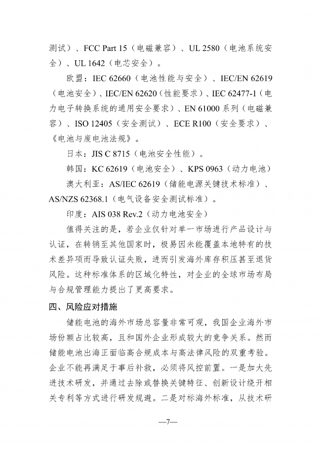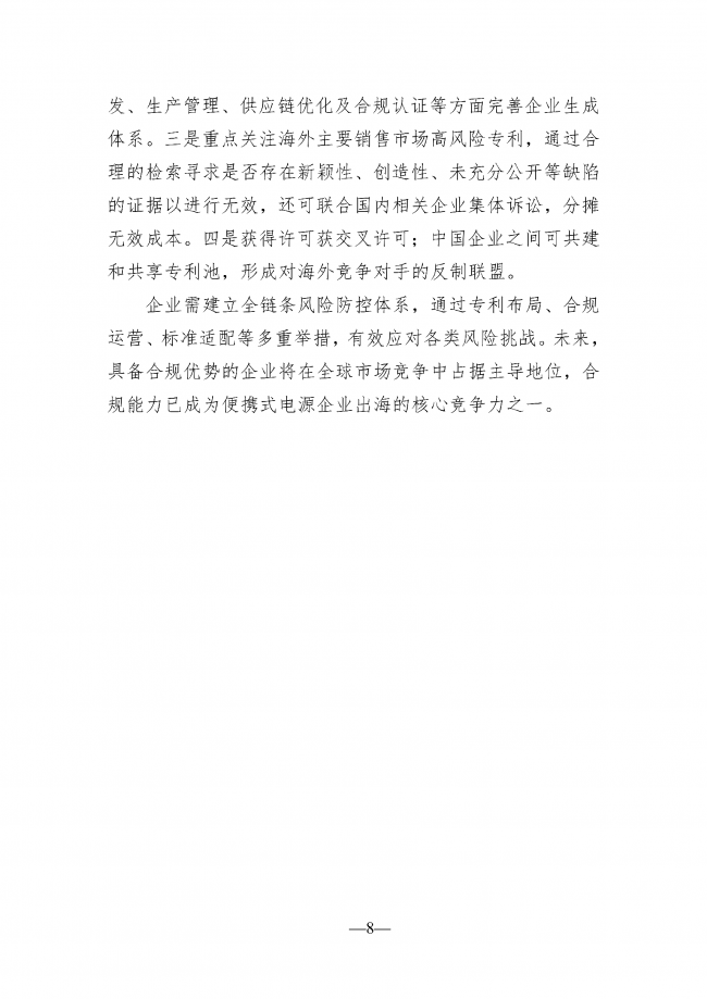 面对高合规成本与高法律风险的双重考验,企业需将风控前置,构建全链条风险防控体系:一是加大先进技术研发,通过创新设计绕开专利壁垒;二是对标海外标准,从研发、生产、供应链到合规认证完善体系;三是针对海外高风险专利开展无效检索,联合国内企业集体诉讼分摊成本;四是通过许可、交叉许可或共建专利池形成反制联盟。未来,合规能力将成为储能电池企业出海的核心竞争力,具备合规优势的企业将在全球市场竞争中占据主导地位。