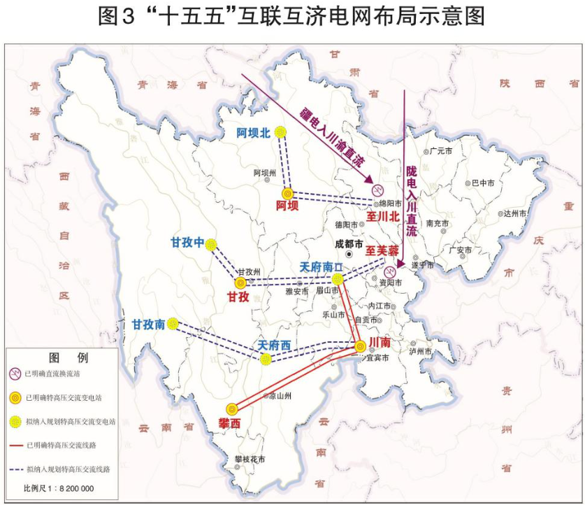 拓展外电入川通道,推动陇电入川、疆电入川,衔接藏电入川,研究规划建设省间灵活互济通道。建成投产甘肃巴丹吉林沙漠基地送电四川、新疆送电川渝等外电入川特高压直流通道,研究规划建设省间灵活互济通道,研究论证金上二回、藏电入川等跨省直流通道。建成投产攀西、甘孜主变扩建、阿坝主变扩建等一批省内特高压交流骨干网架工程。规划建设阿坝北、甘孜中、甘孜南1000千伏特高压输变电工程。