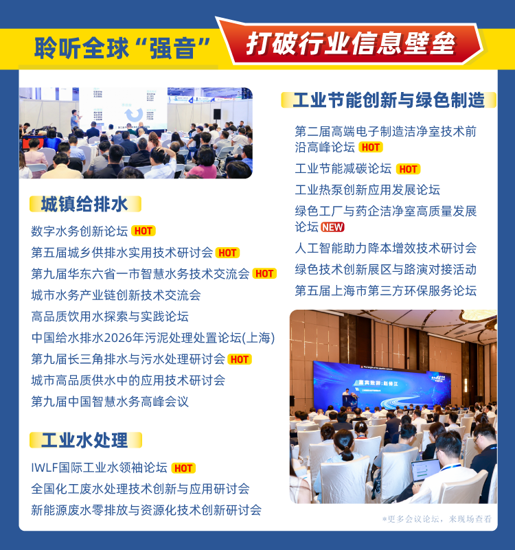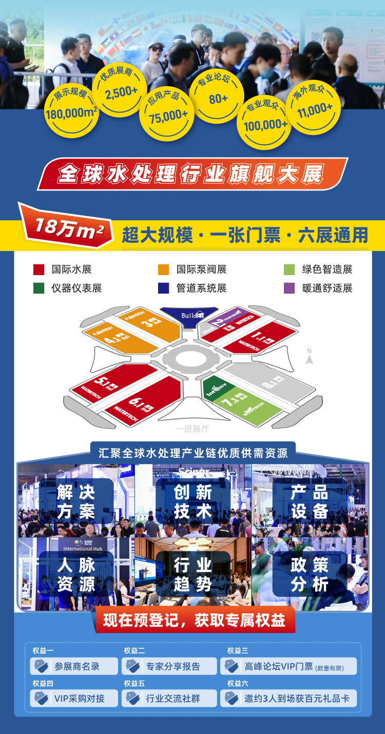 作为全球规模最大的水处理展,第十八届上海国际水展(WATERTECH CHINA)将于2026年6月9-11日在上海|国家会展中心(虹桥)开启新征程。本届展会将全方位展示污废水、污泥、过滤与分离、膜及膜配件、泵阀、仪器仪表、管道系统等系列产品,覆盖市政、工业、水环境、领域,为到场的10万名观众提供一站式多场景采购平台,同时为企业增加品牌曝光,提高市场份额,高效助力企业业务的焕新增长。
