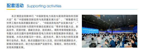 本次博览会同期举行“中国新型电力系统与源网荷储协同创新大会”和“中国储能创新应用与高质量发展大会”、“雅鲁藏布江世界工程水电高质量发展论坛”、“中国液流电池产业发展大会”、“成渝电力科技创新与西部市场融合发展论坛”等多场专题大会、新品发布、资源对接、圆桌交流会、颁奖典礼、商务考察等配套活动。专题大会的主题内容将围绕新型电力系统与新型能源体系建设、新型储能、水风光多能互补一体化、超充技术、算力与电力协同发展等行业热点、焦点、难点话题进行深入交流,探讨绿色能源新技术、新模式和新业态,助力电力能源产业数字化、智能化、绿色化转型,实现高质量发展。业数字化,智能化、绿色化转型,实现高质量发展。